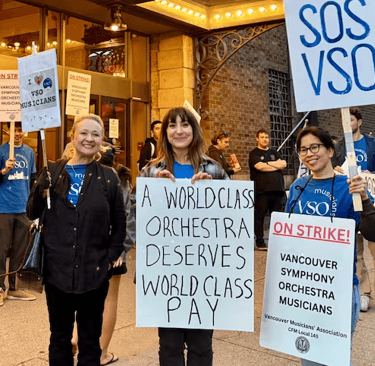 Musicians with the Vancouver Symphony Orchestra (VSO) walked off the job late Thursday, launching the first strike in the orchestra’s 107-year history. Carrying signs declaring “A world-class orchestra deserves world-class pay,” players set up picket lines outside the downtown venue.